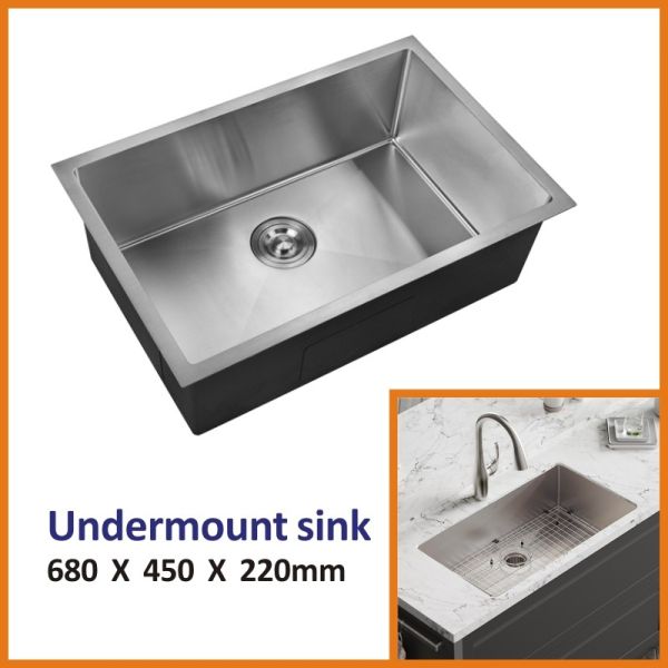 The overall dimensions of the U6845 Stainless are 680 x 450 x 220mm and a 730mm minimum cabinet size is required. This sink also features a stain, heat, and scratch resistant surface; it comes fully insulated and equipped with sound dampening pads. All sinks are covered by our limited lifetime warranty; your satisfaction is guaranteed.